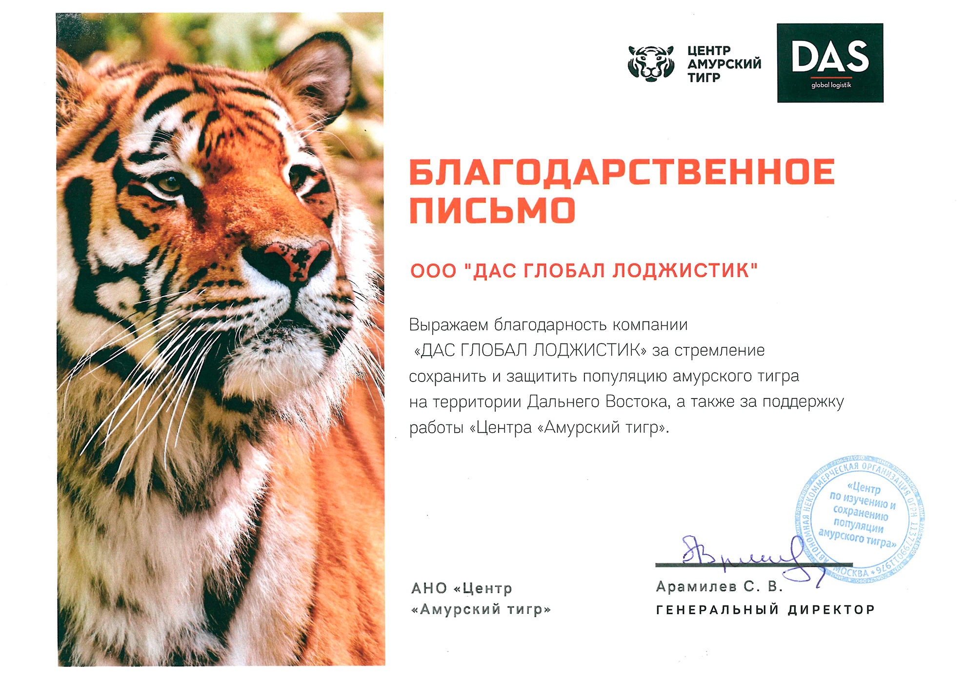 ДАС ГЛОБАЛ ЛОДЖИСТИК стала партнером проекта Центр «Амурский тигр» и поддержала программы, направленные на сохранение и преумножение амурского тигра на территории Дальнего Востока Российской Федерации. Центр «Амурский тигр» - организация, созданная Русским географическим обществом по инициативе Президента Российской Федерации Владимира Путина.