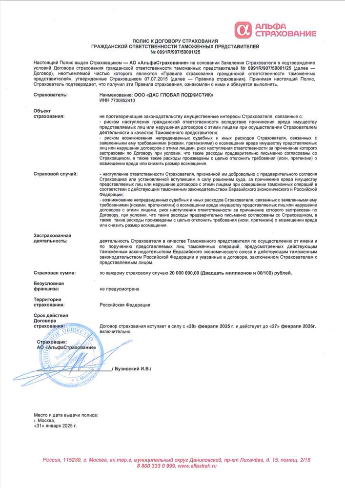 • Страховой полис (АО «АльфаСтрахование») № № 0991R/907/0000001/25 от 28 Февраля 2025 г. – страхование гражданской ответственности при осуществлении деятельности таможенных представителей.