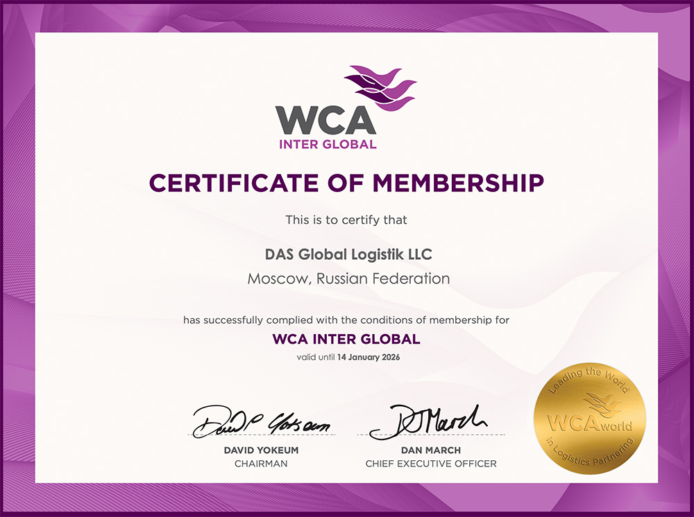• Сертификат WCA PROJECTS, подтверждающий членство в международной ассоциации WCA PROJECTS по проектным грузам на 2026 г.